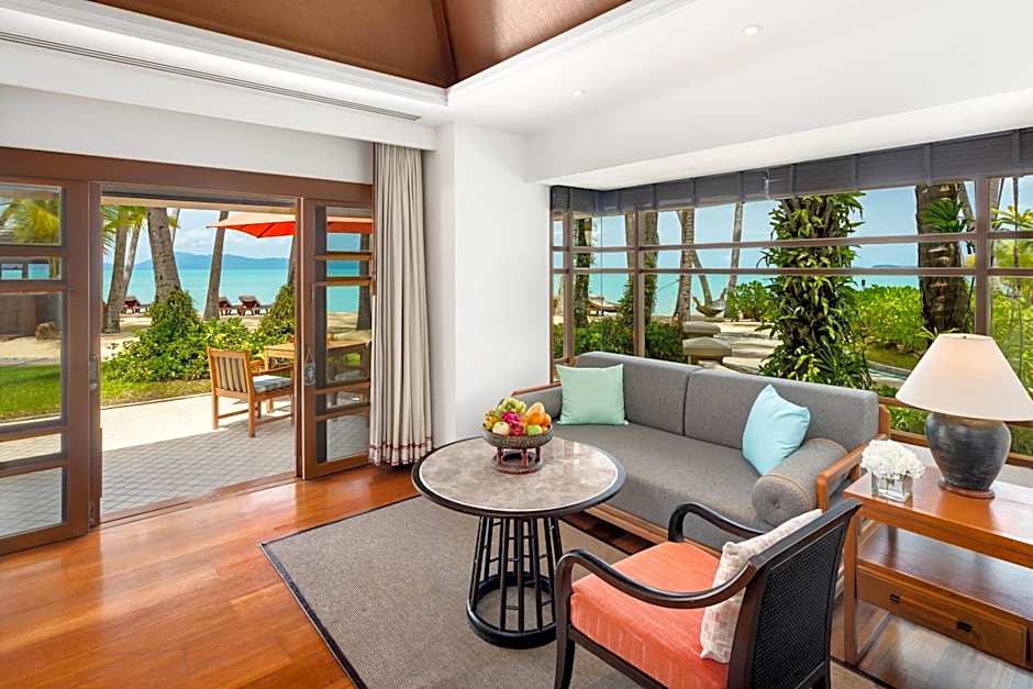 Located at beach front, this one-bedroom Thai villa comes with a terrace and living space. The bathroom provides two white vanity sinks with round bathtub and separate shower.